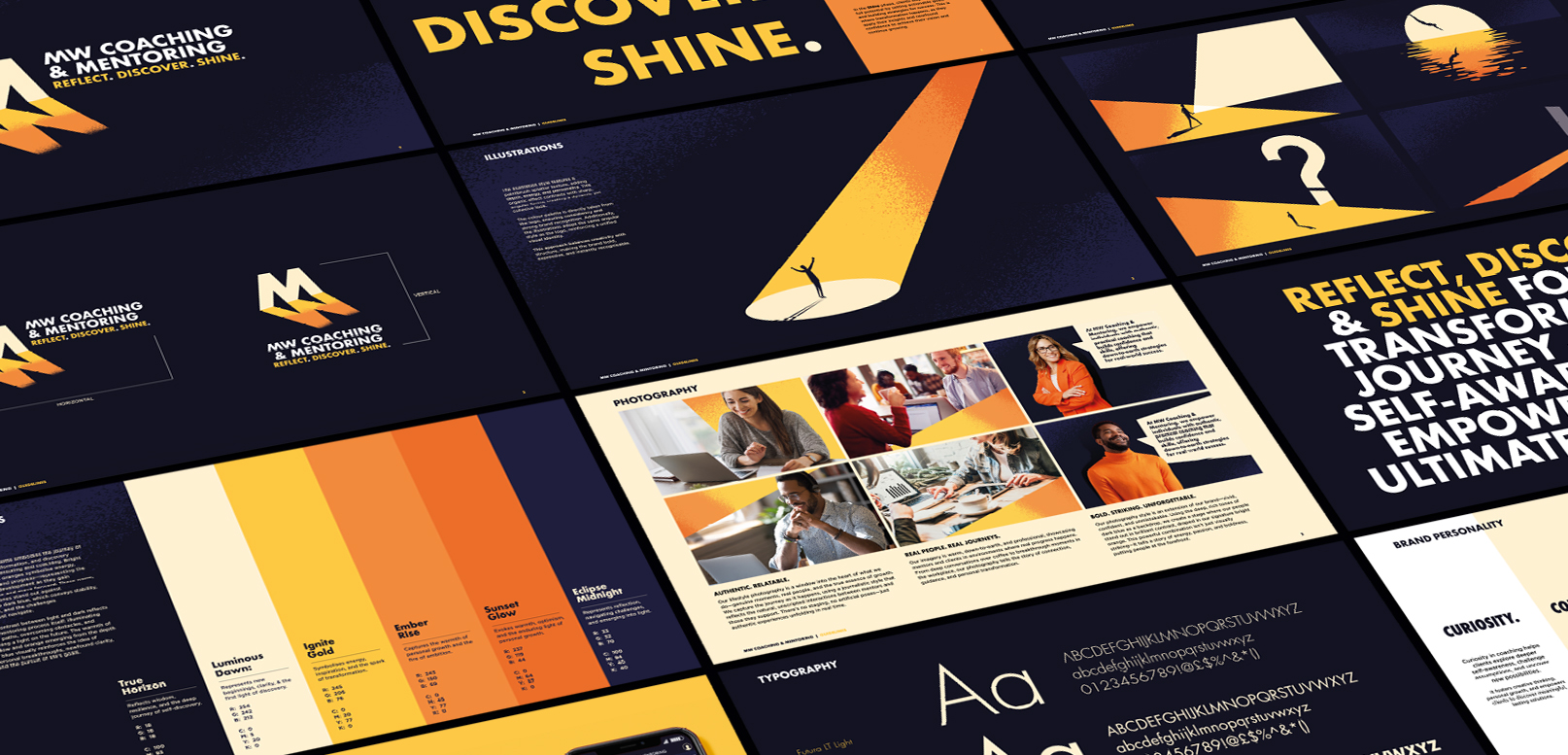 MW Coaching and Mentoring help individuals and teams unlock their full potential through personalised career and leadership coaching, both virtually and face to face. Their ethos is simple yet powerful: guide people to shine. Their new brand identity had to reflect this mission. A visual story of reflection, discovery, and brilliance.