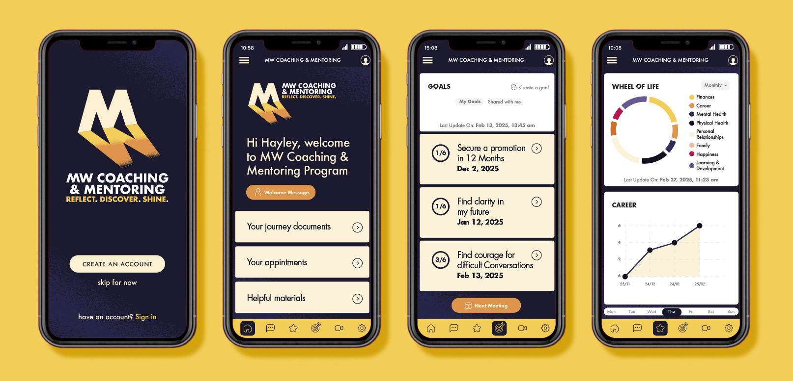 The logo embodies the brand’s values: Reflect, Discover, Shine. Mirrored ‘M’ and ‘W’ forms symbolise balance and introspection, while the openings in the ‘M’ suggest new opportunities. Light flowing through these shapes represents empowerment and brilliance, reflecting the mission to guide people to become their best selves.